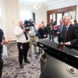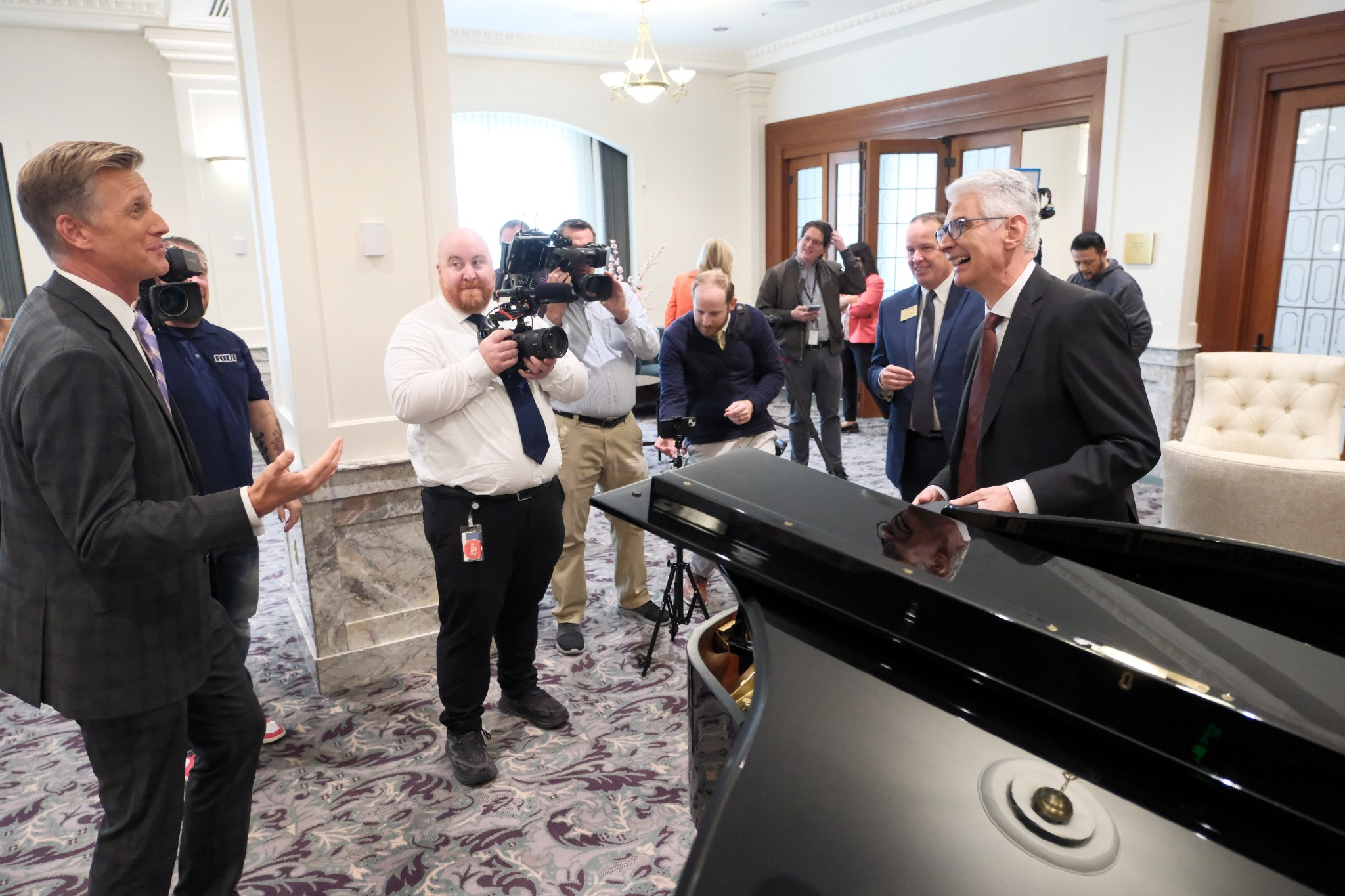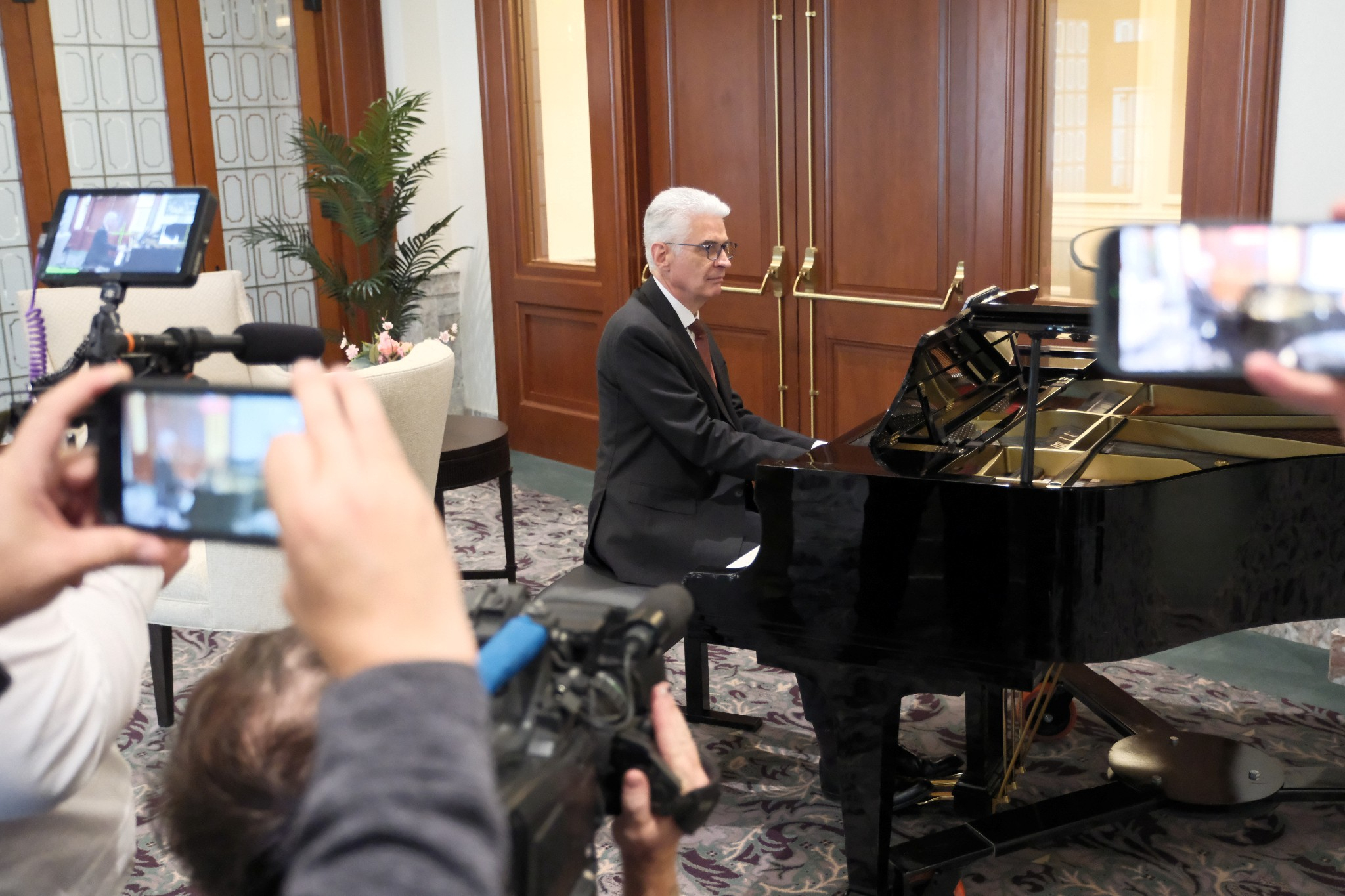 Le vendredi 7 novembre 2025, Gérald Caussé, le nouveau membre du Collège des douze apôtres, joue du piano pour les membres des médias, dans le Joseph Smith Memorial Building. Frère Caussé est un pianiste accompli. Il a développé un amour pour la musique lorsqu’il a commencé à prendre des leçons de piano, à l’âge de 7 ans. 2025 par Intellectual Reserve, Inc. Tous droits réservés.