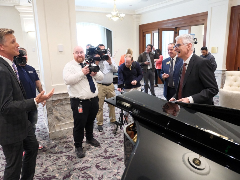 Vendredi, frère Caussé a pris quelques minutes pour jouer « Venez, venez, sans craindre le devoir » au piano, pour les médias.