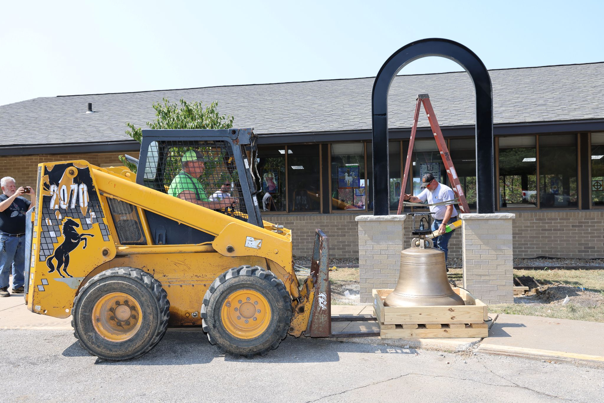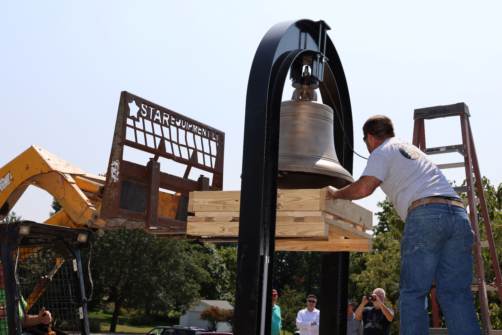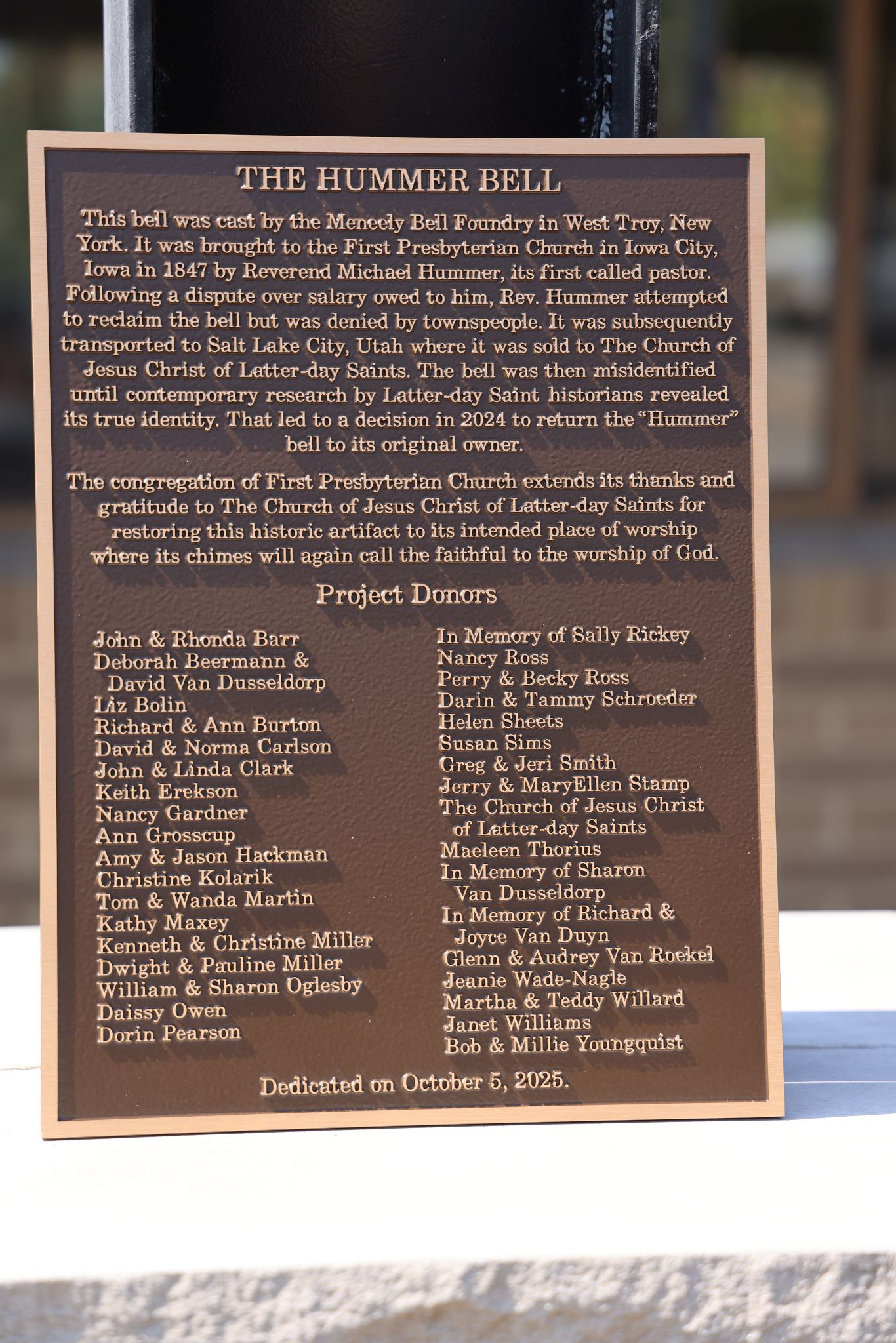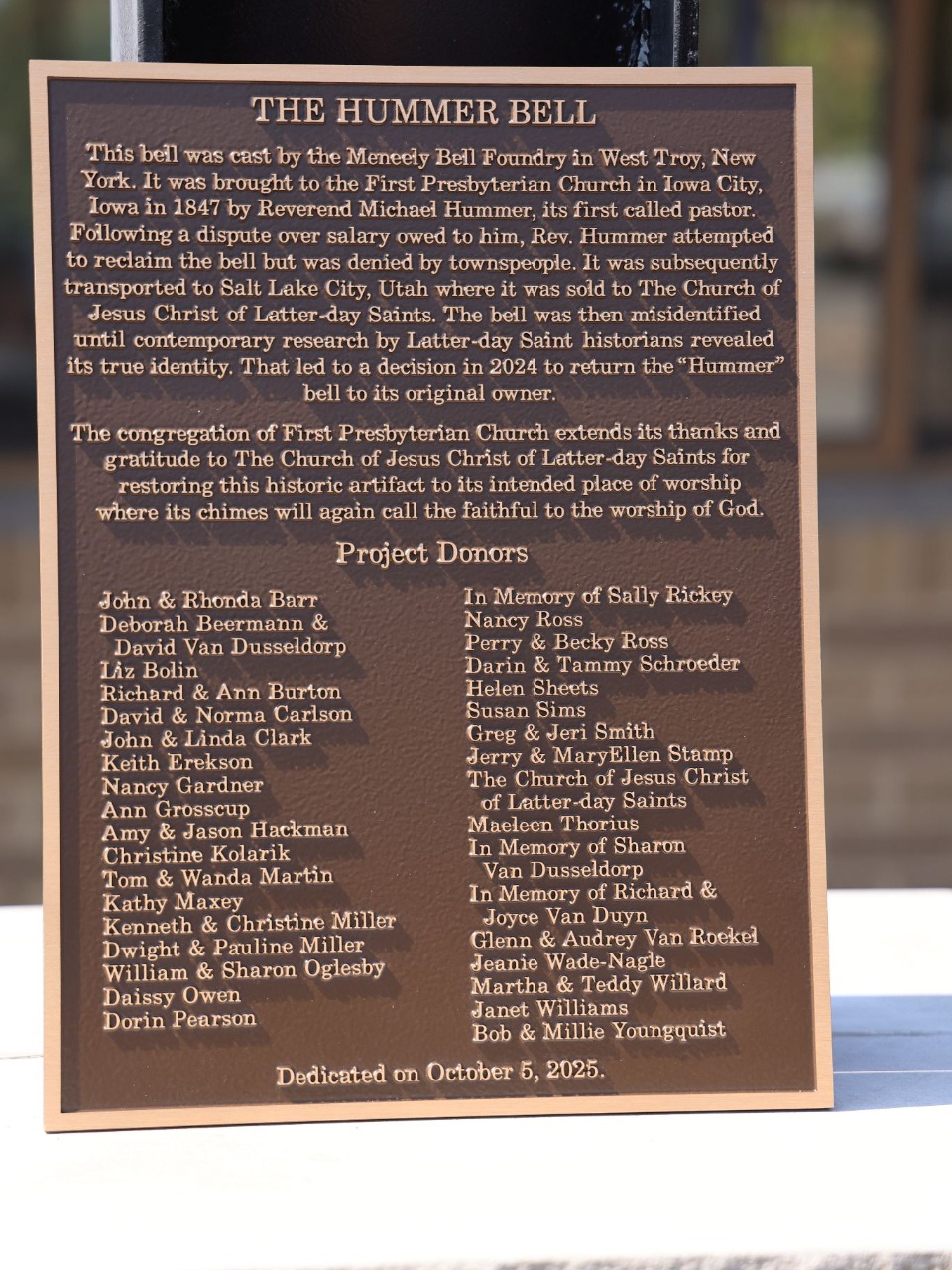 Une cérémonie a eu lieu à Iowa City le dimanche 5 octobre 2025 pour marquer le retour de la cloche de Hummer, d’une largeur de 83 cm (33 pouces) et pesant 360 kg (800 livres).